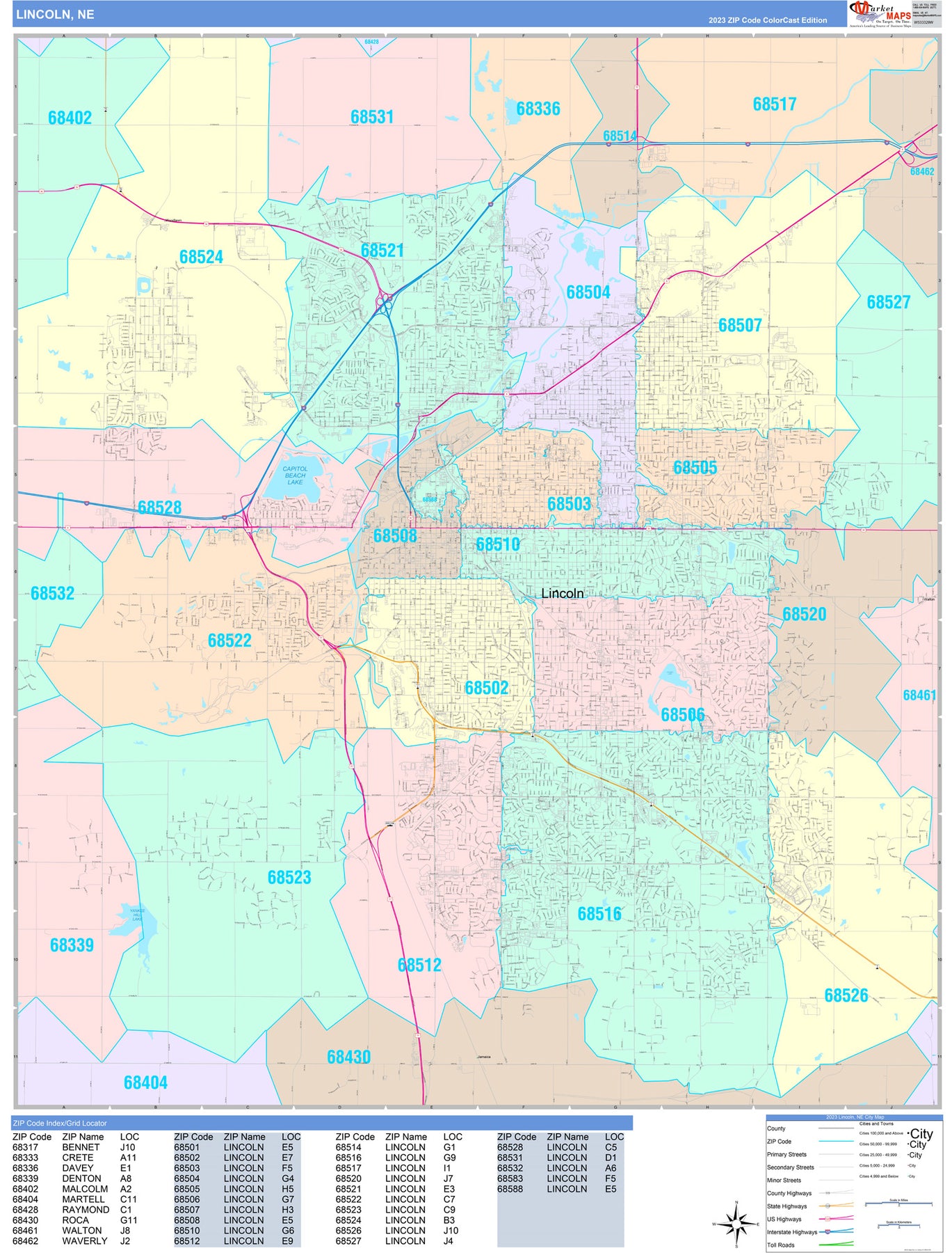 Colorcast Zip Code Style Wall Map of Lincoln, NE by Market Maps
